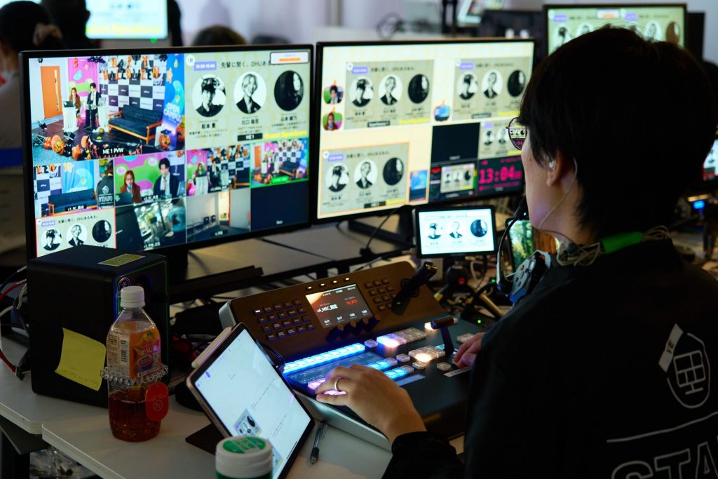 当日は在学生も活躍。2年の三上さん(2024年入学)が学生司会を、1年の小澤さん、佐藤さんが会場レポーターを務めました。3名はデジタルハリウッド大学の広報イベントを支える在学生チーム「キャンパスPRプロジェクト」のメンバーです。カメラや音声などのライブ配信はDHUのオープンキャンパスではおなじみ、在学生・卒業生による映像配信チーム「NOAH NAME」が担当しました。