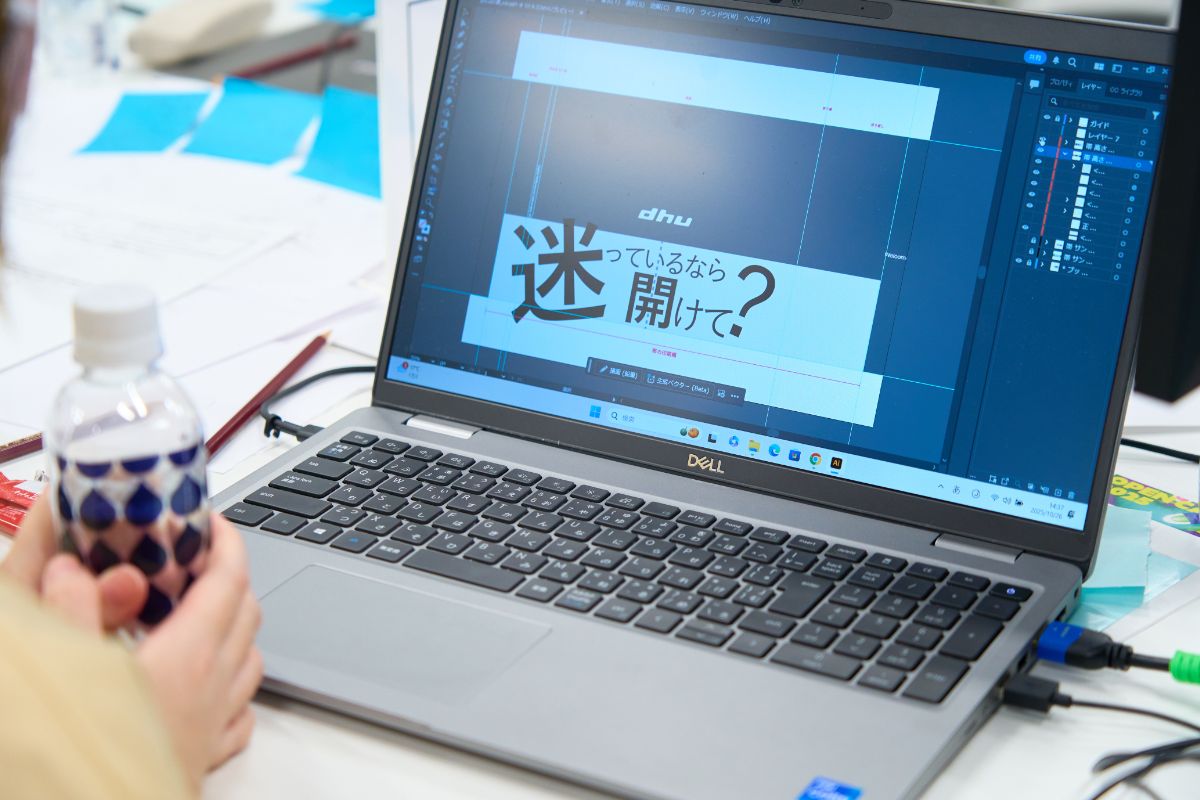 参加した高校生たちは、コンセプトブックを片手にお互いに感じたことを話し合います。同時に、コンセプトブックのデザイン担当者やDHUの広報スタッフにヒアリングを行い、討議の結果をワークシートにまとめていきました。企画が固まったグループは、在学生TA(ティーチングアシスタント)の助けを借りながら、Adobe Illustratorを使って思い思いの帯をデザインしていきました。