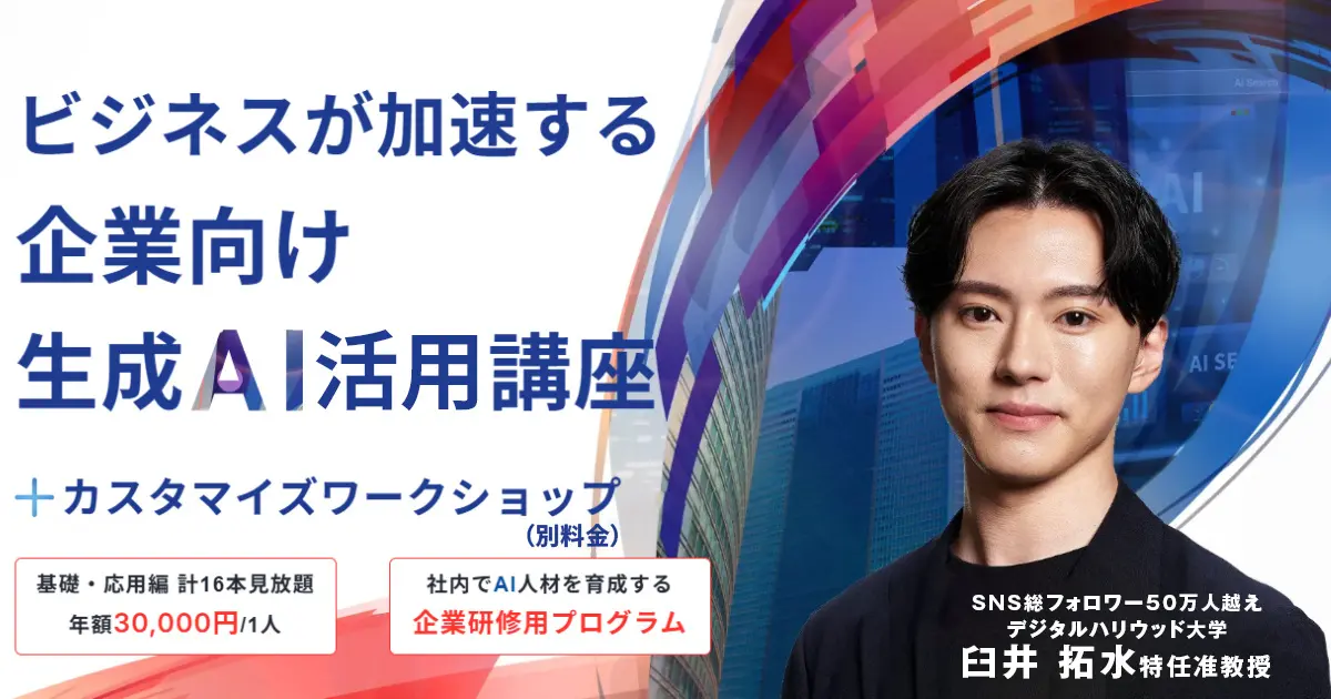 臼井 拓水特任准教授とデジタルハリウッド株式会社(本学設置会社)が共同で開発した法人向けオンライン教育プログラム「生成AIビジネス活用講座」が、2025年11月19日より提供を開始しました。