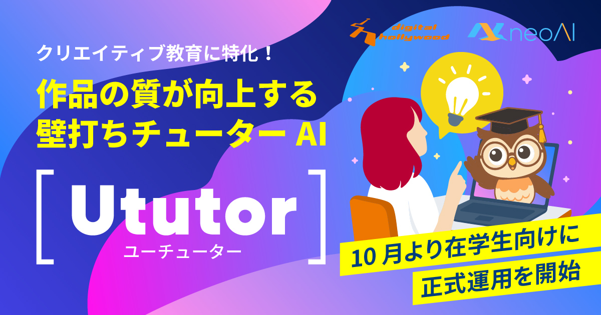 「生成AI大賞」は、生成AIの活用事例を対象に、課題設定や実装の工夫、社会的インパクトなどの観点から審査・表彰するアワードです。「Ututor」は、学習者が制作した作品に対してフィードバックを行うクリエイティブ学習向けの教育支援AIとして、デジタルハリウッドとneoAIの共同プロジェクトとして開発が進められてきました。2025年10月から運用が開始され、現在はデジタルハリウッド大学の学生向けにも公開されています。