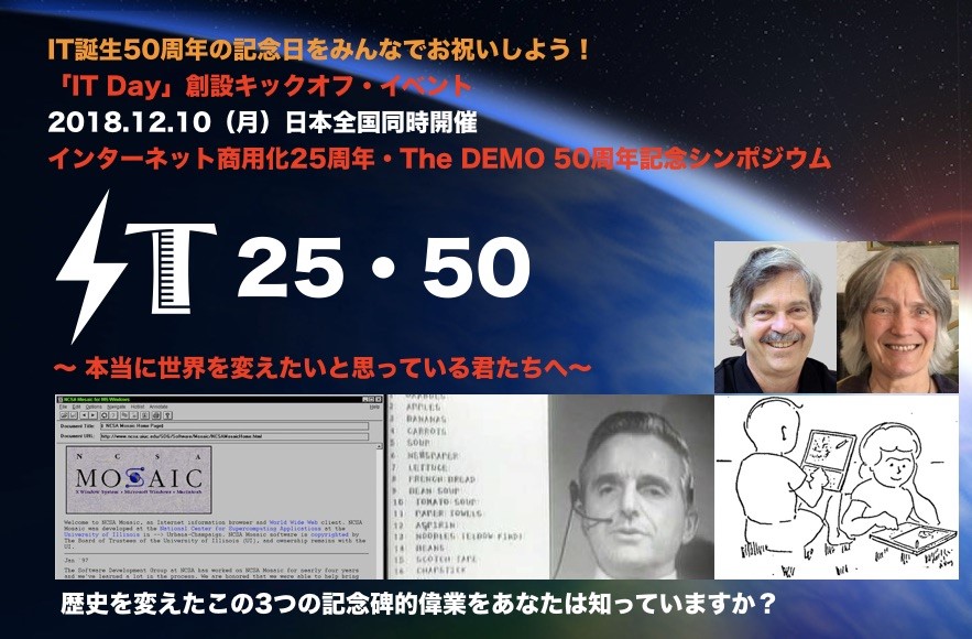 デジタルハリウッド大学では、「パーソナルコンピュータの父」アラン・ケイ氏の賛同を得て、2018年12月10日(月)に開催されるインターネット商用化25周年 & 「The Demo」 50周年記念シンポジウム「IT25・50 ~本当に世界を変えたいと思っている君たちへ~」に協賛し、デジタルハリウッド大学駿河台キャンパスにサテライト会場(東京・御茶ノ水会場)を設置し、基調講演のライブ中継と特別シンポジウムを開催いたします。