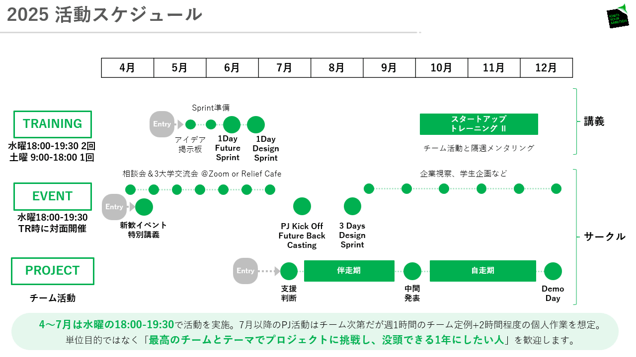 前半はGoogleベンチャーズが開発したデザインスプリントの手法をベースに、「リサーチ→プロトタイプ→ユーザーテスト」を高速で回すトレーニングを行います。後半はチームを組み、12月のDemo Day(成果発表会)に向けて実際にモノを作り、社会実装を目指します。このサイクルを通じて、単にアイデアを出すだけでなく「作って、使ってもらって、作り直して磨いていく」経験を積んでもらうことが目的です。