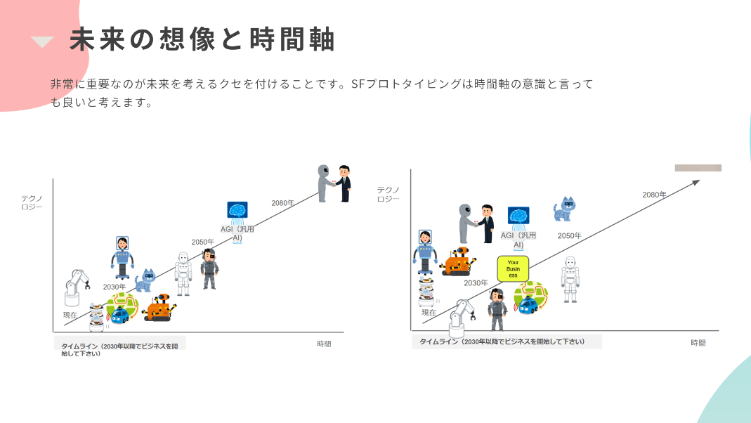 それともうひとつ、この「未来年表」からは、それぞれが自分の中で持っている時間軸が分かります。「今のテクノロジーから発展して、この先100年くらいで何ができるのか」といった感覚が掴めているかどうかが分かる。ただ残念ながら、この感覚をきちんと掴めている人には会ったことがありません。